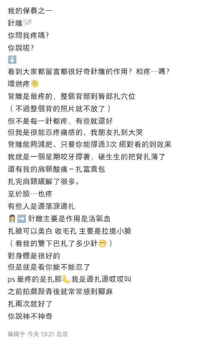 她还告诉大家,自己就是一个星期咬牙撑着突然地成的,也是硬生生的靠针雕给背扎薄了!