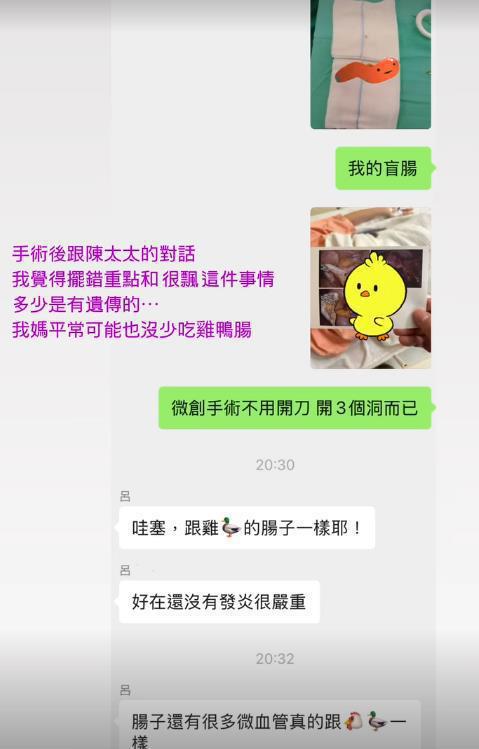 甚至她还和妈妈在手术之后开玩笑,说切出来的阑尾像是鸡鸭的肠子。